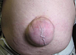 The most common type of hernia to develop in adults. They occur in a part of the abdominal wall known as the inguinal canal, and are much more common in men. Men develop Inguinal Hernias and women tend to develop Femoral Hernias. Men develop hernias 10:1 to women. A man’s testicles must descend through this area before birth. This leaves a natural defect called the internal inguinal ring that can develop into a hernia if it doesn’t seal properly. As a result, the contents of the abdomen, such as intestine, intestinal fat, or bladder may protrude through the opening creating pain and/or a bulge. Inguinal hernias are located in the lower abdomen just above the leg crease, near or adjacent to the pubic area. It is also known that if a person has an inguinal hernia, 30% of these patients will have a hernia on the opposite side and 30% will have Umbilical hernias.